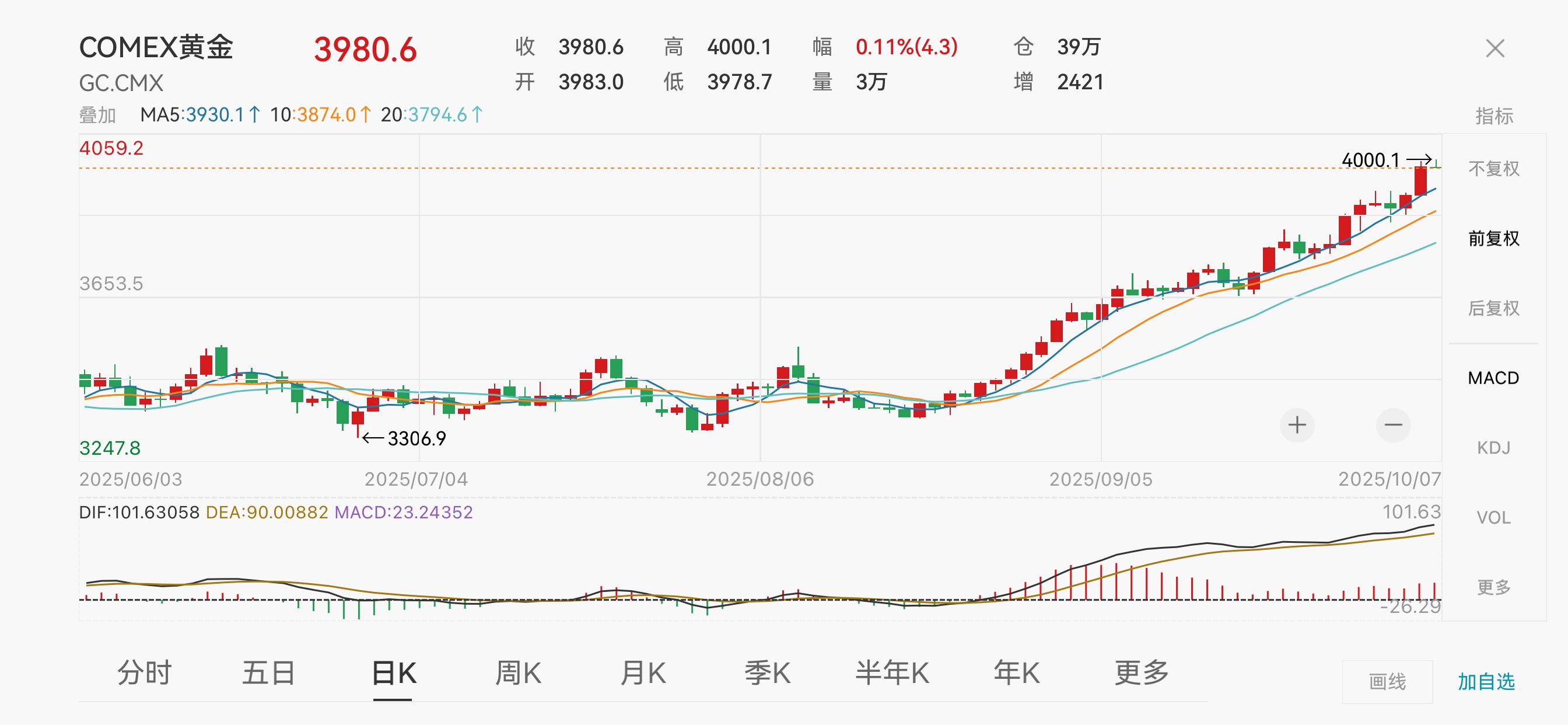中新经纬10月7日电 7日上午易策略,纽约期金历史首次突破4000美元/盎司,年内涨逾50%。现货黄金一度冲高至3977.45美元/盎司,创下历史新高。