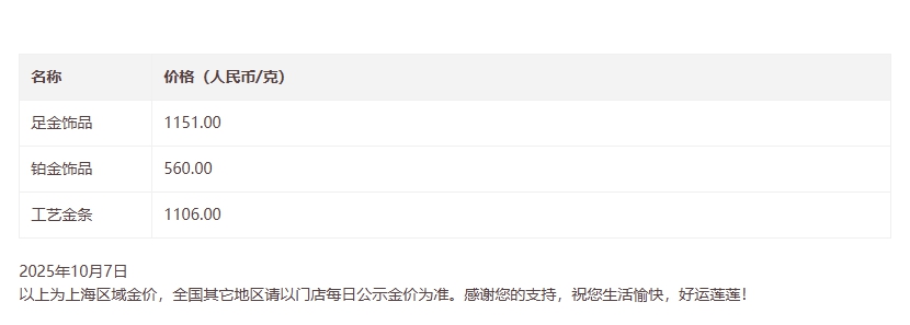 国内品牌金饰价格随之大涨。中新经纬查询发现易策略,截至10月7日发稿,菜百足金999饰品价格为1105元/克;周大福足金(饰品、工艺品类)价格为1155元/克;周生生足金饰品价格为1157元/克;老庙足金饰品价格为1151元/克。