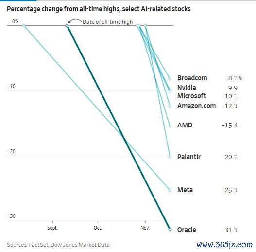 如下图所示,当是截至本周三(在周四进一步暴跌之前),甲骨文股价便已从9月10日高位下跌了约三分之一,领跌一众AI概念股。