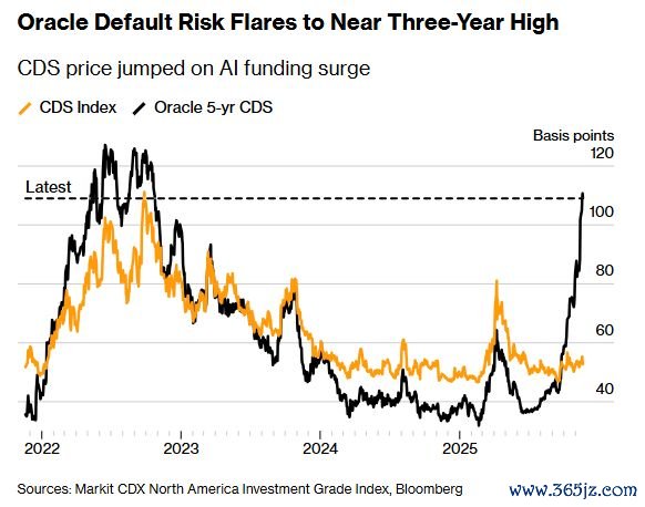 根据洲际交易所(ICE)数据服务公司的统计,近几个月来,防范该公司未来五年债务违约的成本已攀升了两倍——周三甲骨文5年期CDS利差达到111个基点,相当于每保障1000万美元本金每年需支付约11.1万美元。