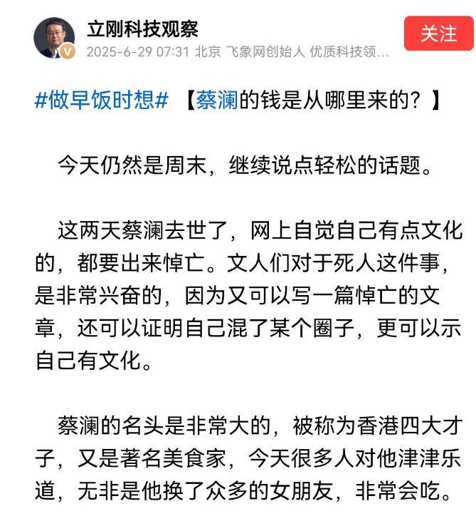 不得不说,项立刚的话是非常犀利了,在蔡澜去世还不到7天,他就敢这样大肆评论,那他是什么来头呢?