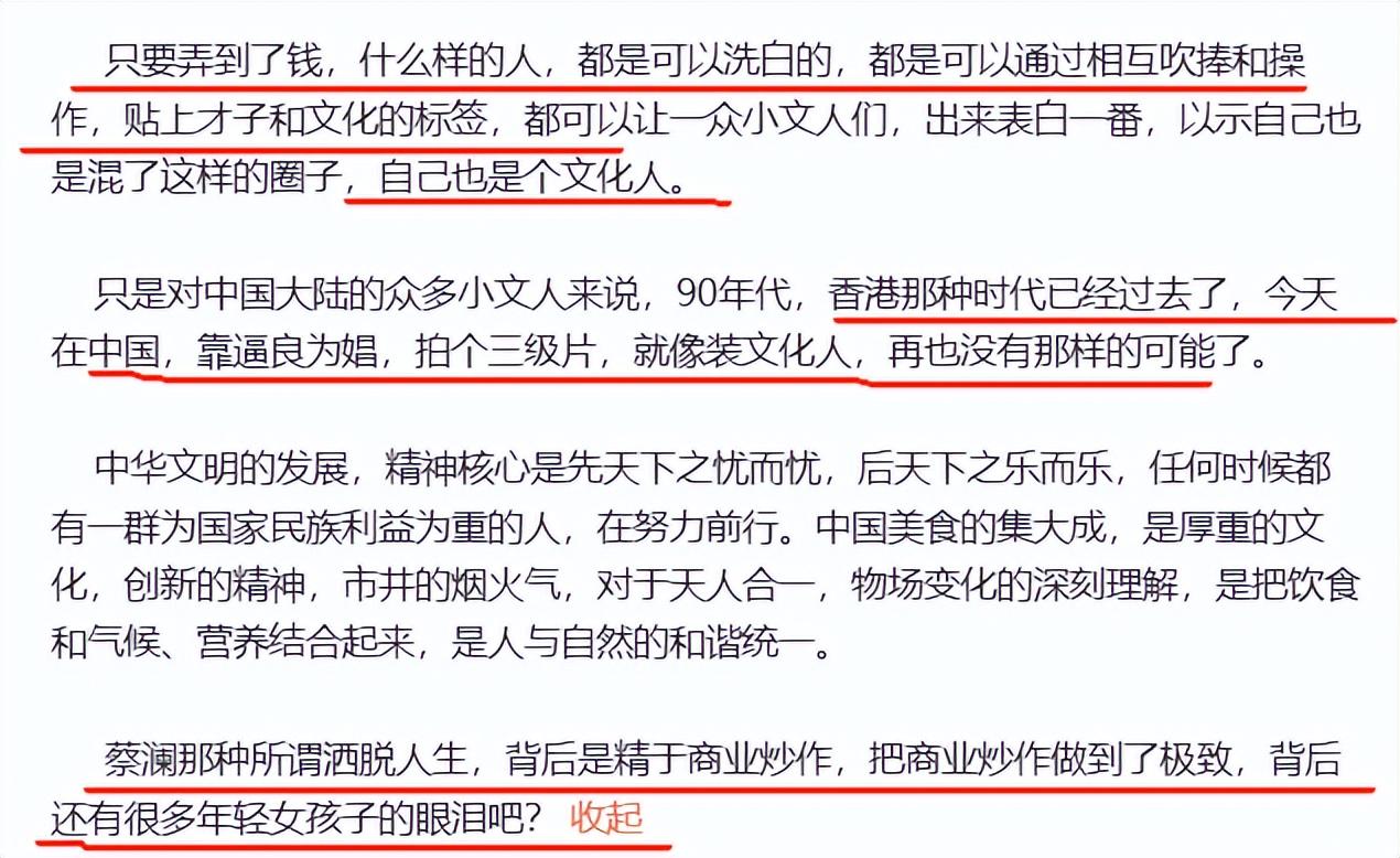 他发言非常尖锐,细数蔡澜的几大“罪状”,将网友眼中的香港四大才子之一的蔡澜,数落的一文不名。