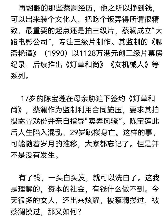 另外就是蔡澜的三级片争议,他是否迫害了女性参与行业,为自己牟利。
