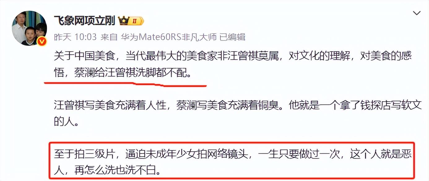 最犀利的是,项立刚直接否定蔡澜的个人名望,说他根本算不上文人,就是个唯利是图的商人掮客。