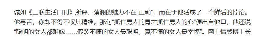但有一个人偏偏不随大流,愣是站出来批评蔡澜是一个道德有缺的人,还说他所谓的“洒脱人生”,怕是建立在多少女人的眼泪之上。