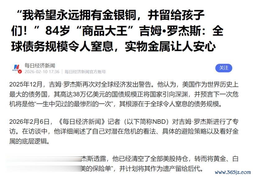 84岁的吉姆·罗杰斯在访谈中阐述,全球债务规模令人窒息,实物金属更让人安心。